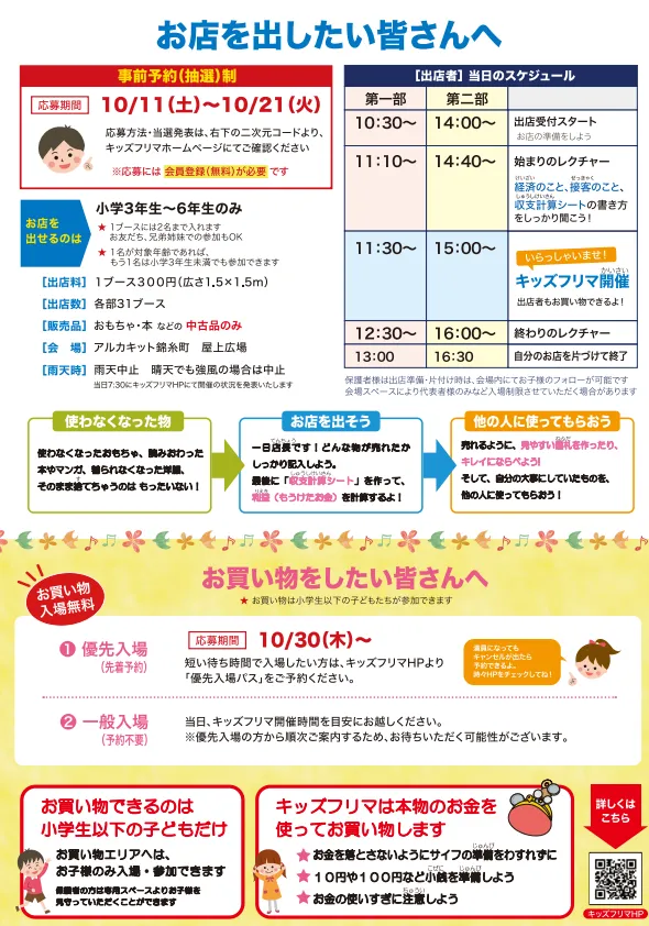 出店は小学3年生~6年生までの子供のみで、1ブースには2名まで参加ができます。こちらは事前予約制で抽選となりますので、参加したい方は期間内に応募をお忘れなく。