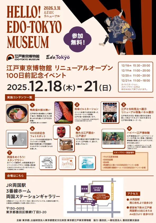 2025年12月18日〜21日、JR両国駅周辺で「江戸東京博物館リニューアルオープン100日前記念イベント」が開催されます。参加無料で江戸文化を体感できる体験型イベントが満載!